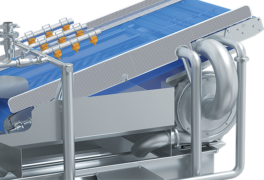 The suction knife effectively removes water from the conveyor belt and vegetable surface, reducing spin drying time and improving the quality of clean vegetables.
